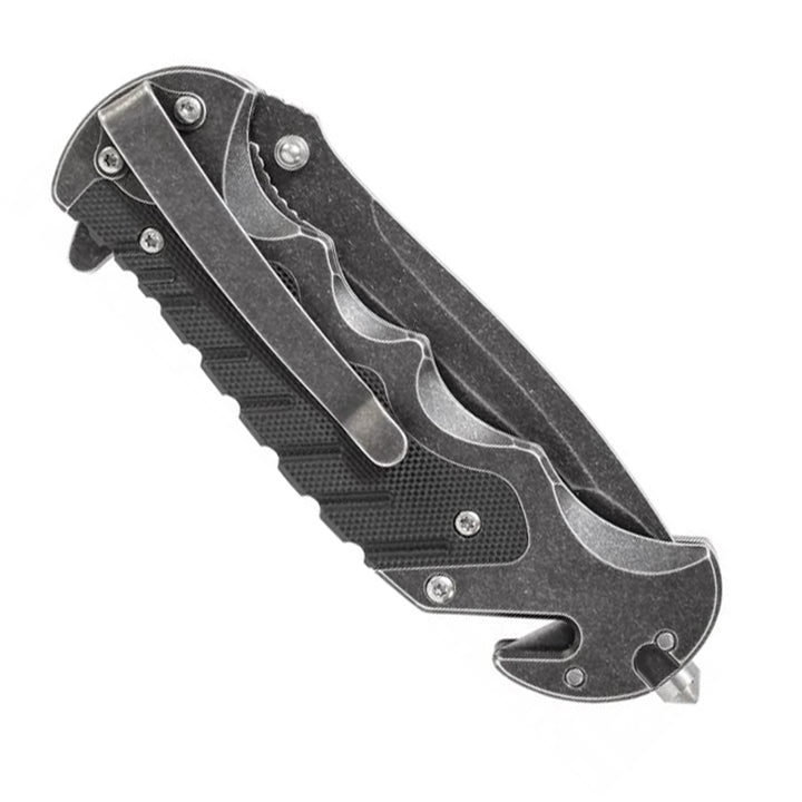 Smith & Wesson Border Guard Liner Lock Folding Knife, Stone Washed 7Cr17MoV High Carbon Stainless Steel Partially Serrated Tanto Blade with Ambidextrous Thumb Knobs, Thumb Ramp Jimping, and Index Flipper, Stone Washed Stainless Steel Handle with Black Textured & Grooved G-10 Insert, Strap Cutter, Glass Break, & Pocket Clip.