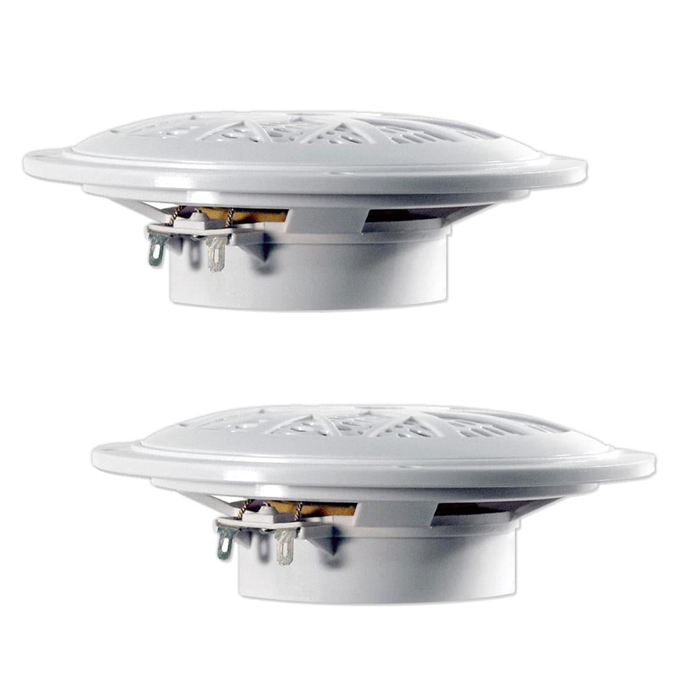 5-1/4" DUAL CONE FULL RANGE MARINE SPEAKER (White) 100 Watts Max 50 Watts RMS POLYPROPYLENE CONE CLOTH SURROUND Molded ABS Basket with MOLDED GRILL 4 Ohm Impedance 20 oz. Magnet 3/4" Aluminum Voice Coil Frequency Response: 100Hz - 18kHz Mount Depth: 1-1/2'' Sold as: Pair