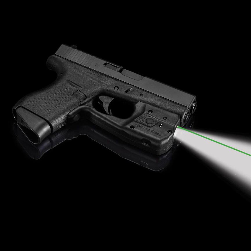 Crimson Trace Laserguard Pro Green Laser & LED Light for GLOCK G42, G43, G43X, G48 A powerful green laser sight and 150 Lumen LED white light in a single compact unit Instinctive Activation, which activates the unit with a normal firing grip Provides (4) hours of battery life with a (1) Lithium battery (included) (4) modes of operation: Laser + Light, Laser Only, Light Only, and Laser + Light Strobe Max power output of 5mW for a Class 3R Laser - the brightest beam allowed by law Master On/Off Switch Trigger guard attachment User-installed in moments Factory sighted at 50 feet Adjustable for windage and elevation