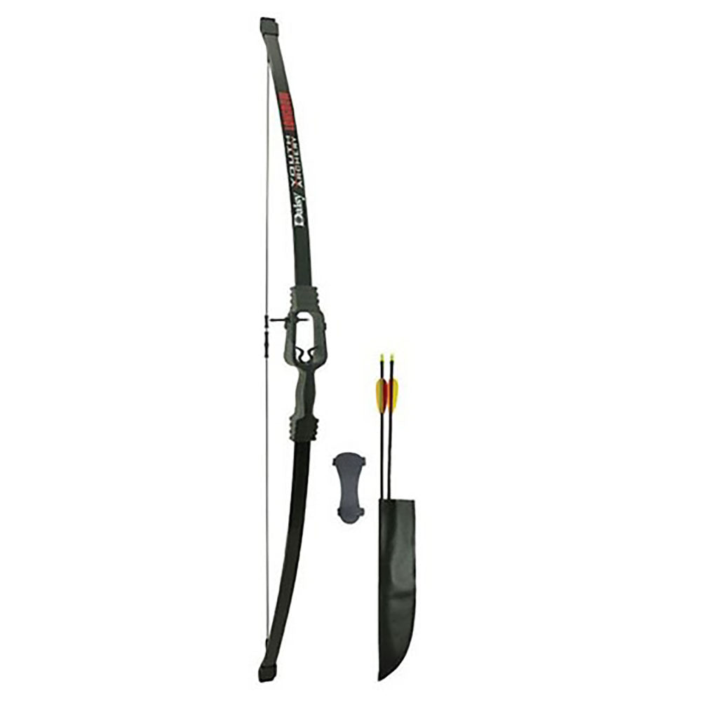 Daisy Youth Long Bow Recommended Age: 10 Years Sized for young shooters and designed with safety in mind Exclusive shoot-through technology ensures the arrow goes downrange It also features an adjustable single pin sight that can be positioned on either side of the riser for left- and right-handed shooters The Daisy Youth Longbow comes with two fiberglass target point arrows, arrow quiver, three finger rollers and an armguard.