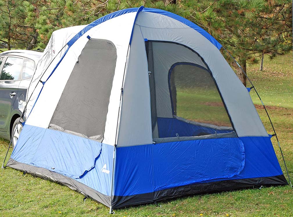 Napier Sportz Dome-To-Go Tent The Sportz Dome-To-Go is the only hatchback tent on the market designed to fit compact vehicles! With an adjustable vehicle sleeve, you can easily connect your tent to the cargo area of your vehicle, creating additional sleeping or storage space for your adventure gear! Move around easily with over 6.5 feet of headroom and keep organized with the internal gear lofts and pockets. Looking to head out for the day on a cool adventure? No problem! The Dome-To-Go easily transforms into a standard ground tent. This convenient travel accessory is always ready for a spontaneous trip, so what are you waiting for? Get out there and experience the great outdoors! Capacity: 4 Dimensions: 8.5' x 8.5' Center Height: 6.7' Weight: 30 lbs Color: Blue & Grey No. of Doors: 2 No. of Windows: 3 Tent Poles: 2 Shock Corded Fiberglass Awning: 2 Shock Corded Steel Storm Flaps: Windows & Doors Water Proofing: 1200mm PU Coating Wall & Roof Material: Polyester Taffeta Windows Material: Polyester Mesh Floor Material: Polyethylene Rainfly Material: Polyester Taffeta with Taped Seams Rear Access Panel Awning 3 Seasons- Spring, Summer, Fall Storage: Gear Loft, Gear Pocket, Lantern Holder & Expandable Carrying Bag