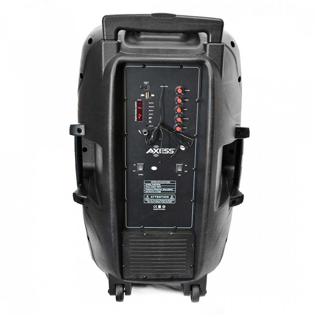 Axess PA System with One 15? Woofer, 6000 Watts Max 15" Speaker with trolley Bluetooth USB/TF Card Inputs AUX Input FM Radio LED Lights Microphone Input/ Echo amp Volume Adjustment Bass amp Treble Adjustments Battery Life: 5+ hours DC 9V Charging Port 7.4/3600 mAh Rechargeable Battery Frequency Response 50HZ-20KHZ Includes Wired Microphone Includes Remote Control