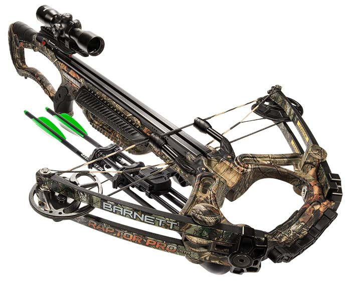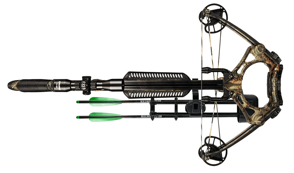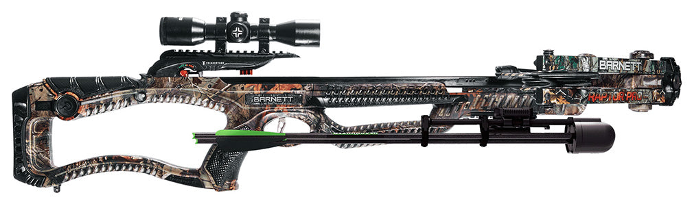 Raptor Pro STR Crossbow Color/Pattern: Realtree Xtra Camo SPECS: Dimensions: 36.5" L x 20" W Weight: 6.9 lbs. Axle to Axle (in): 17.75 Draw Weight (lbs): 187 Kinetic Energy (ft lbs): 135 Power Stroke (in): 16.25 Speed (fps)*: 400 Trigger Type: TriggerTech FEATURES: TriggerTech Frictionless Release Technology Single Bolt Assembly Soft-Lok Floating Bristle Arrow Retainer Fiberglass Composite Step-Through Riser Anti-Dry Fire (ADF) Trigger System Metal Injection Molded (MIM) Trigger CNC Machined Aluminum Flight Track One Picatinny Rail Crank Cocking Device Compatible Finger Safety Reminders Pass-Through Foregrip String Dampeners INCLUDES: 4x32mm Illuminated Scope Rope Cocking Device Side-Mount Quiver Two 22" Headhunter Arrows Lubrication Wax