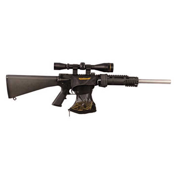 Tired of picking up .223 brass from your AR? The AR-15 Brass Catcher attaches to the forearm of any AR with hook and loop webbing and captures the ejected brass. It prevents brass from being scattered around your shooting area.Also works great in preventing hot brass from landing on shooter or other people next to the shooter.Wire frame holds fabric in correct shape and allows brass to enter bag without disruption to bolt function or interrupt cycling. Captures and holds approximately 30 rounds. Convenient zipper at bottom of mesh bag makes emptying simple.