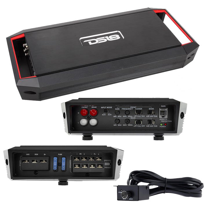 DS18 Gen-X Series Class A/B 4 Channel Amplifier, 360W RMS/900W MAX 360 Watts RMS/900 Watts MAX 90 x 4 RMS @ 2 Ohms 60 x 4 RMS @ 4 Ohms DIM (W X H X L) 7.5" x 2.125" x 15" Fuses: 2 x 15A 2 Ohm Stable RCA Low Level Inputs High pass filter: 50Hz-500Hz Low pass filter: 50Hz-500Hz Bass Boost: 0/6/12dB 4-Way Protection with Diagnostic LED Remote bass knob