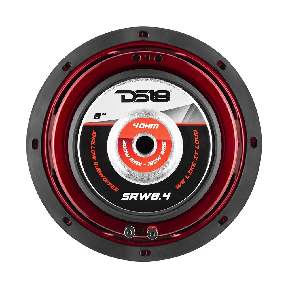 DS18 8" Shallow Mount Woofer, 150W RMS/300W Max, Single 4 Ohm Voice Coil 300 Watts Max 150 Watts RMS Mounting Depth: 2.95" Red Stamped Steel Basket 1-1/2" CCA Voice Coil Single 4 Ohm Voice Coil Sensitivity: 86 dB Frequency Response: 25 Hz - 250 Hz Paper Cone Large Rubber Surround 32 oz. Ferrite Magnet Recommended Lo Pass Crossover: 120 Hz Sold Individually