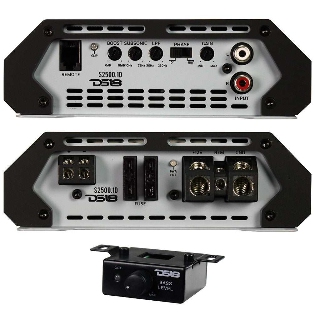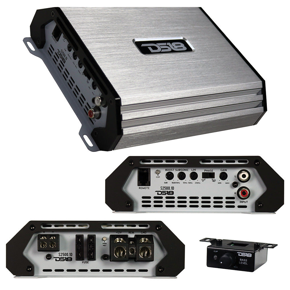 DS18 Select Series Full Range Class D Monoblock Amplifier, 900W RMS/2500W MAX - Silver 900 x 1 RMS @ 1 Ohm (14.4V) 600 x 1 RMS @ 2 Ohms (14.4V) 350 x 1 RMS @ 4 Ohms (14.4V) Dim (W X H X L) 5.8" x 1.8" x 7.79" 1 Ohm Stable Class D Fuse: 2 x 40a Input Sensitivity: 0.2 - 6V Frequency Range: 20Hz - 500Hz Low Pass Filter: 50 - 250 Hz Subsonic Filter: 10 - 55 Hz Phase Control Bass Boost: 0 - 18 dB Signal-to-Noise Ratio: &gt 90dB THD: &lt 0.3% Gain control Surface mount component Technology Multi-layer PCB Trace Layout Clipping, Power And Protection LED Indicator Short Circuit, Thermal And Voltage Protection Remote Bass Controller