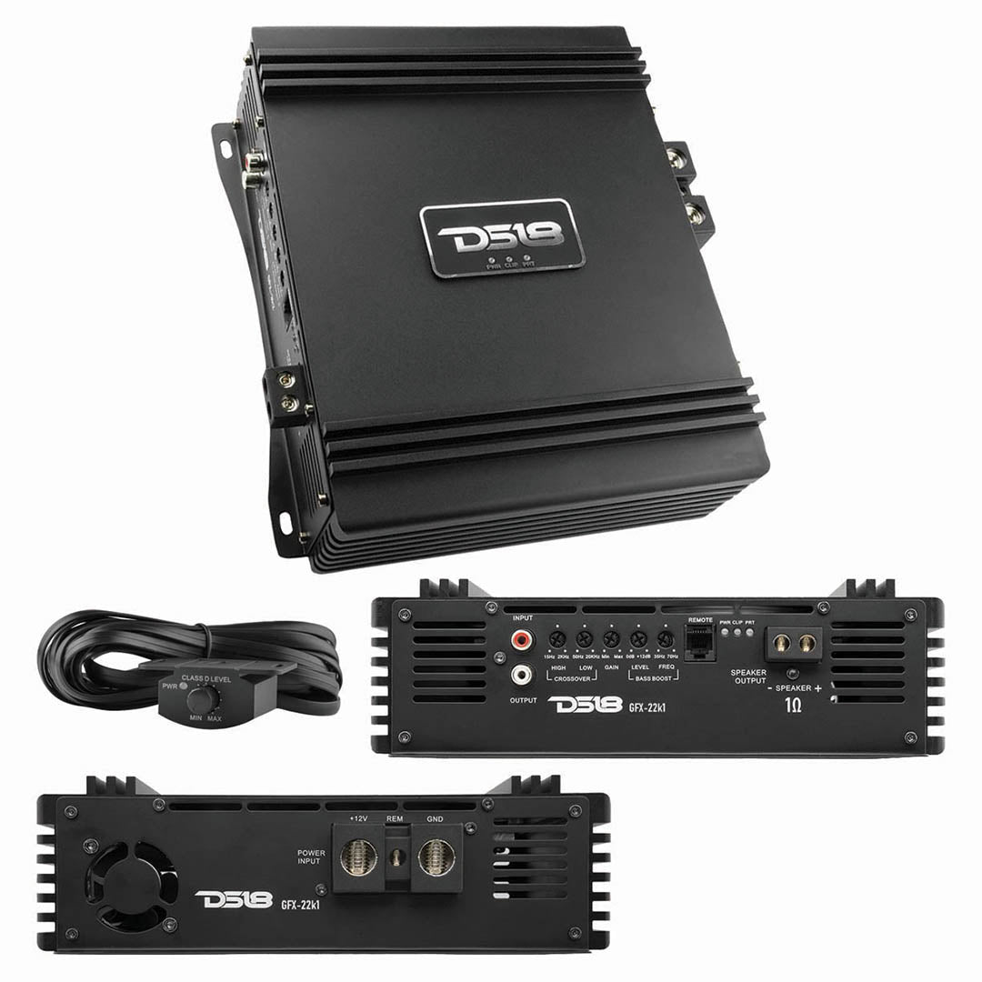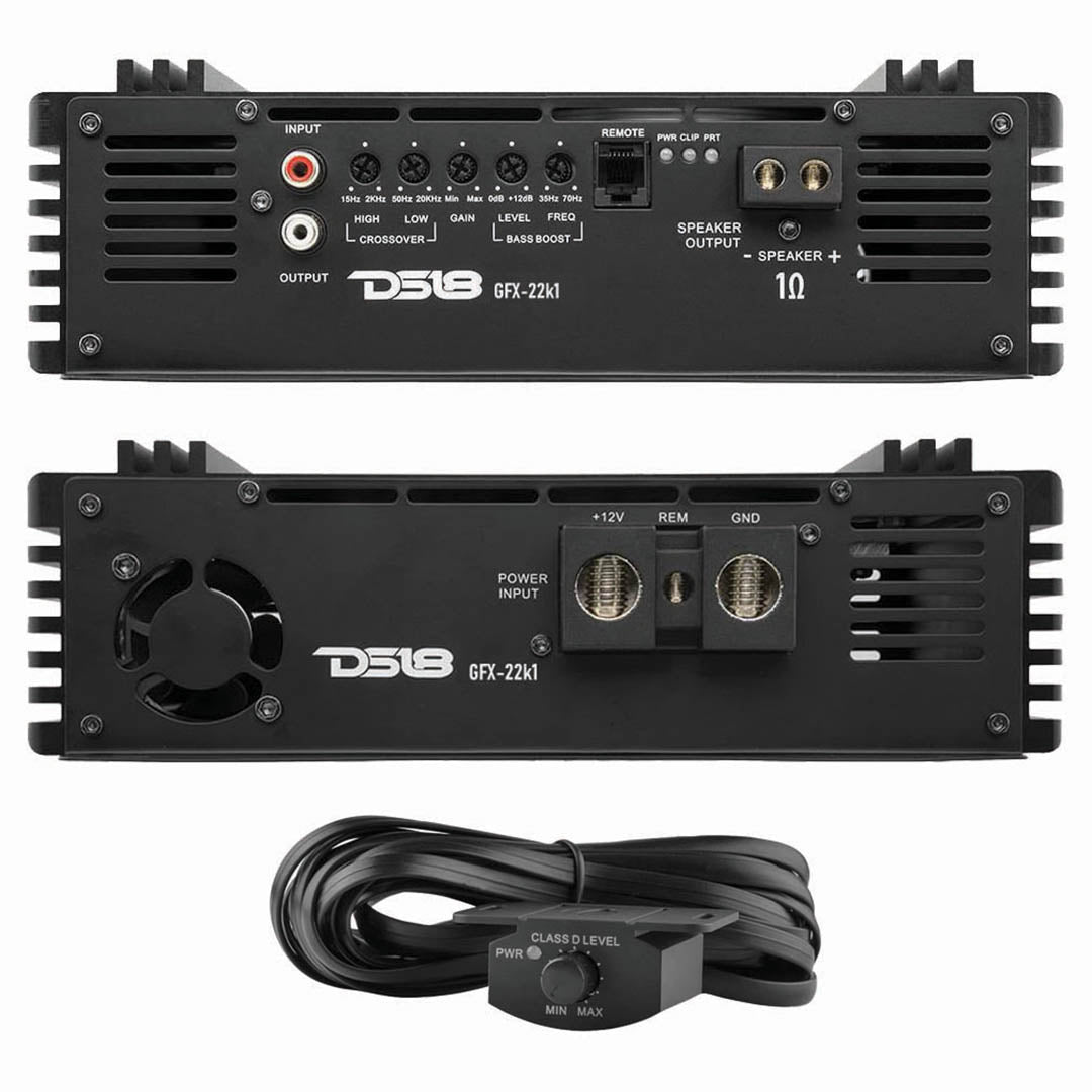 DS18 Pro Full Range Class D Mono Amplifier 1 Ohm 2200 Watts RMS 2200 Watts RMS 2200 X 1 @ 1 Ohm (14.4V) 1500 x 1 @ 2 Ohms (14.4V) Dim (W X H X L) 9.29" x 2.83" x 7.7" Recommended Fuse: 220A (Not Included) Full Range Class - D Amplifier 1 Ohm Stable Hi Pass Crossover: 15 Hz - 2 KHZ (12dB/Oct) Lo Pass Crossover: 50 Hz - 20 KHZ (12dB/Oct) Frequency Response: 15 Hz - 20 KHZ Bass Boost: 0-12dB Bass Frequency: 35 Hz - 70 Hz Preamp In/Outputs Remote Bass Control Compact Size and wide Band Crossover for more applications Surface Mount Component Audio Precision Quality Control Verification Stable & Reliable Four Layers PCB Trace Layout Heavy Duty Heat-sink Chassis