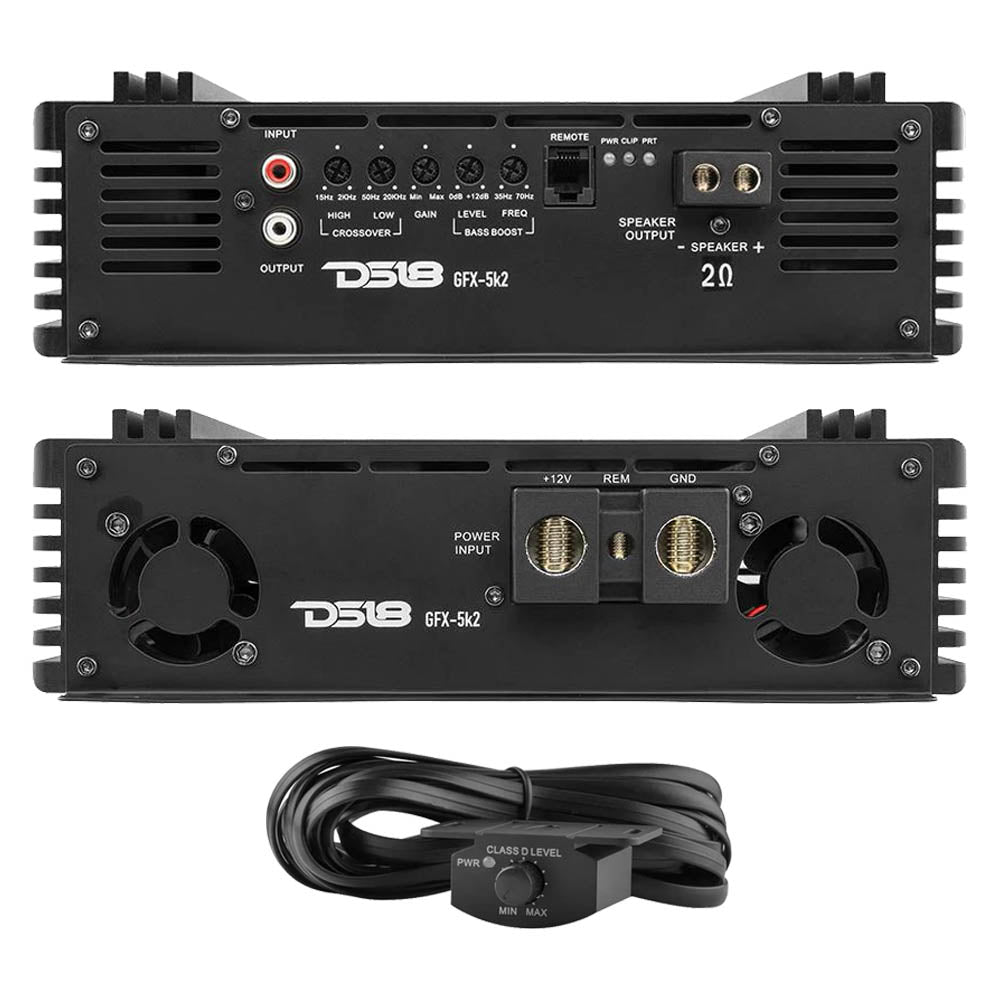 DS18 Pro Full Range Class D Mono Amplifier 2 Ohm 5000 Watts 5000 Watts RMS 5000 X 1 @ 2 Ohms (14.4V) 3500 x 1 @ 4 Ohms (14.4V) Dim (W X H X L) 9.29" x 2.83" x 11.45" Recommended Fuse: 500A (Not Included) Full Range Class - D Amplifier 2 Ohm Stable Hi Pass Crossover: 15 Hz - 2 KHZ (12dB/Oct) Lo Pass Crossover: 50 Hz - 20 KHZ (12dB/Oct) Frequency Response: 15 Hz - 20 KHZ Bass Boost: 0-12dB Bass Frequency: 35 Hz - 70 Hz Preamp In/Outputs Remote Bass Control Compact Size and wide Band Crossover for more applications Surface Mount Component Audio Precision Quality Control Verification Stable & Reliable Four Layers PCB Trace Layout Heavy Duty Heat-sink Chassis Forced Cooling System Built-In