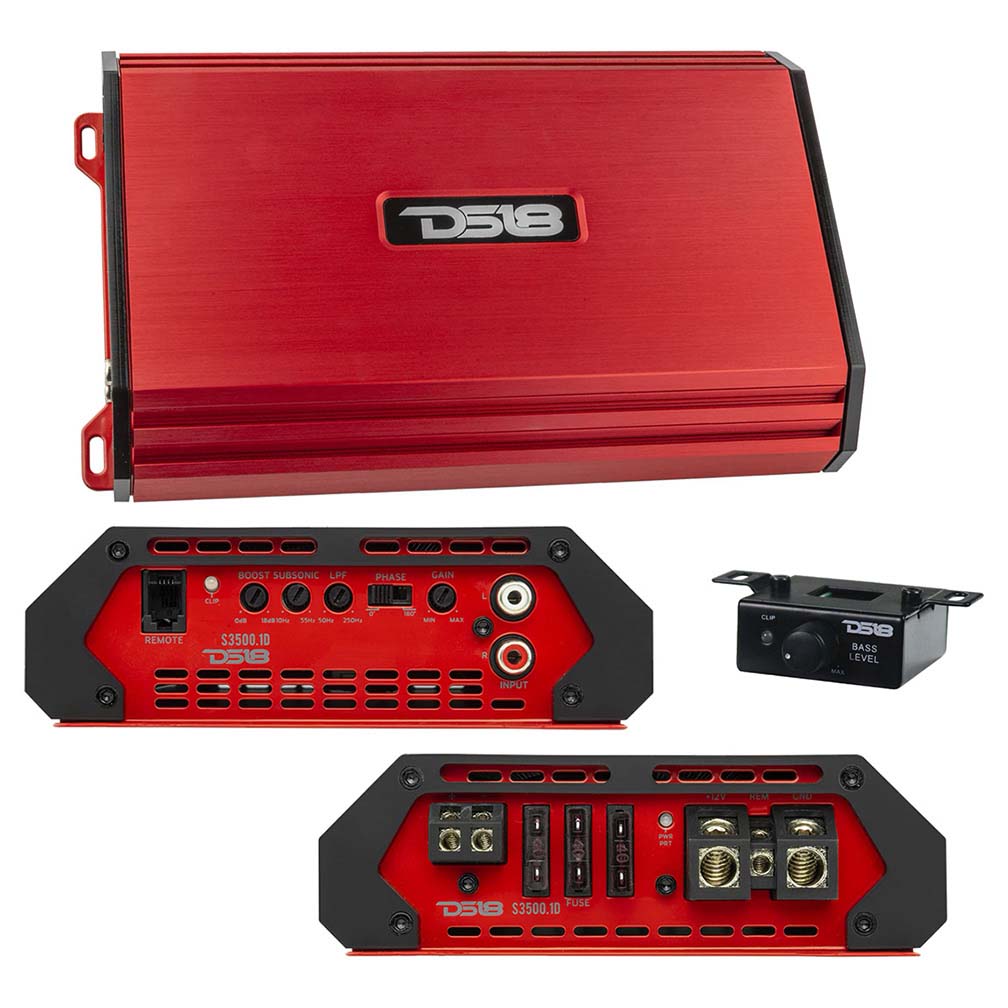DS18 Select Class D Monoblock Amplifier, 1200W RMS/3500W MAX - Red 1200 x 1 RMS @ 1 Ohm (14.4V) 800 x 1 RMS @ 2 Ohms (14.4V) 500 x 1 RMS @ 4 Ohms (14.4V) Dim (W X H X L) 5.82" x 1.87" x 9.76" FUSES: 3 X 40A 1 Ohm Stable Class D S/N Ratio: &gt 90dB Gain Range: 0.2 - 6V Low Pass Crossover: 50 - 250Hz Frequency Response: 50 Hz - 500 Hz Bass Boost: 1 - 18dB Subsonic Filter: 10 - 55Hz Phase Control RCA Inputs Remote Bass Control Surface Mount Component Technology Clipping, Power & Protection LED Indicators Short Circuit, Thermal & Voltage Protection