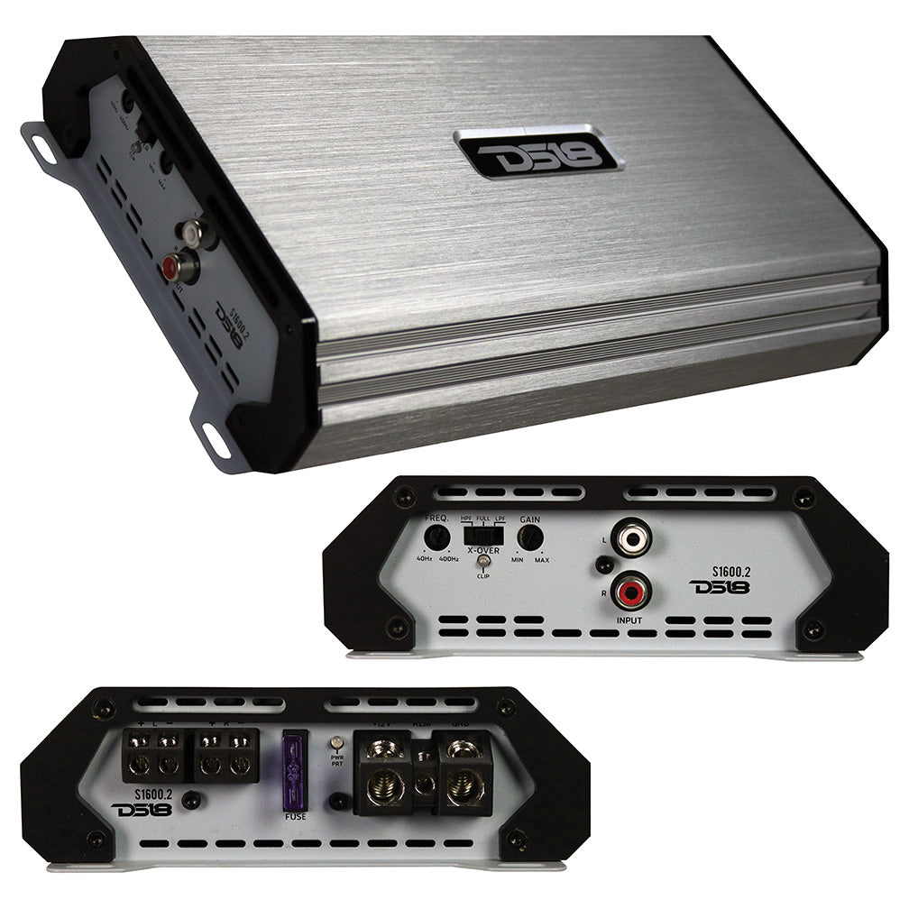 DS18 Select Series Full Range Class AB 2 Channel Amplifier, 260W RMS/1600W MAX - Silver 130 x 2 RMS @ 2 Ohms (14.4V) 90 x 2 RMS @ 4 Ohms (14.4V) 235 x 1 RMS @ 4 Ohms Bridged (14.4V) Dim (W X H X L) 5.8" x 1.8" x 10.9" 2 Ohm Stable Full Range Class A/B Fuse: 1 x 35A Frequency Response: 20 Hz - 20 kHz Hi/Low Pass Crossover: 40 - 400Hz S/N Ratio: &gt 90dB Gain Range: 0.2 - 6V RCA Inputs Surface Mount Component Technology Clipping, Power & Protection LED Indicators Short Circuit, Thermal & Voltage Protection